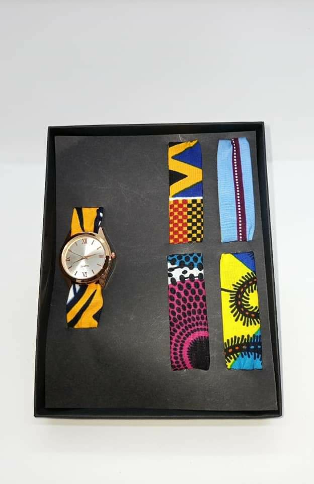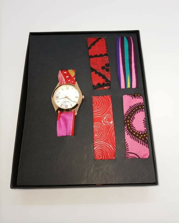 D’où l’idée de la montre avec le bracelet en pagne, un accessoire du